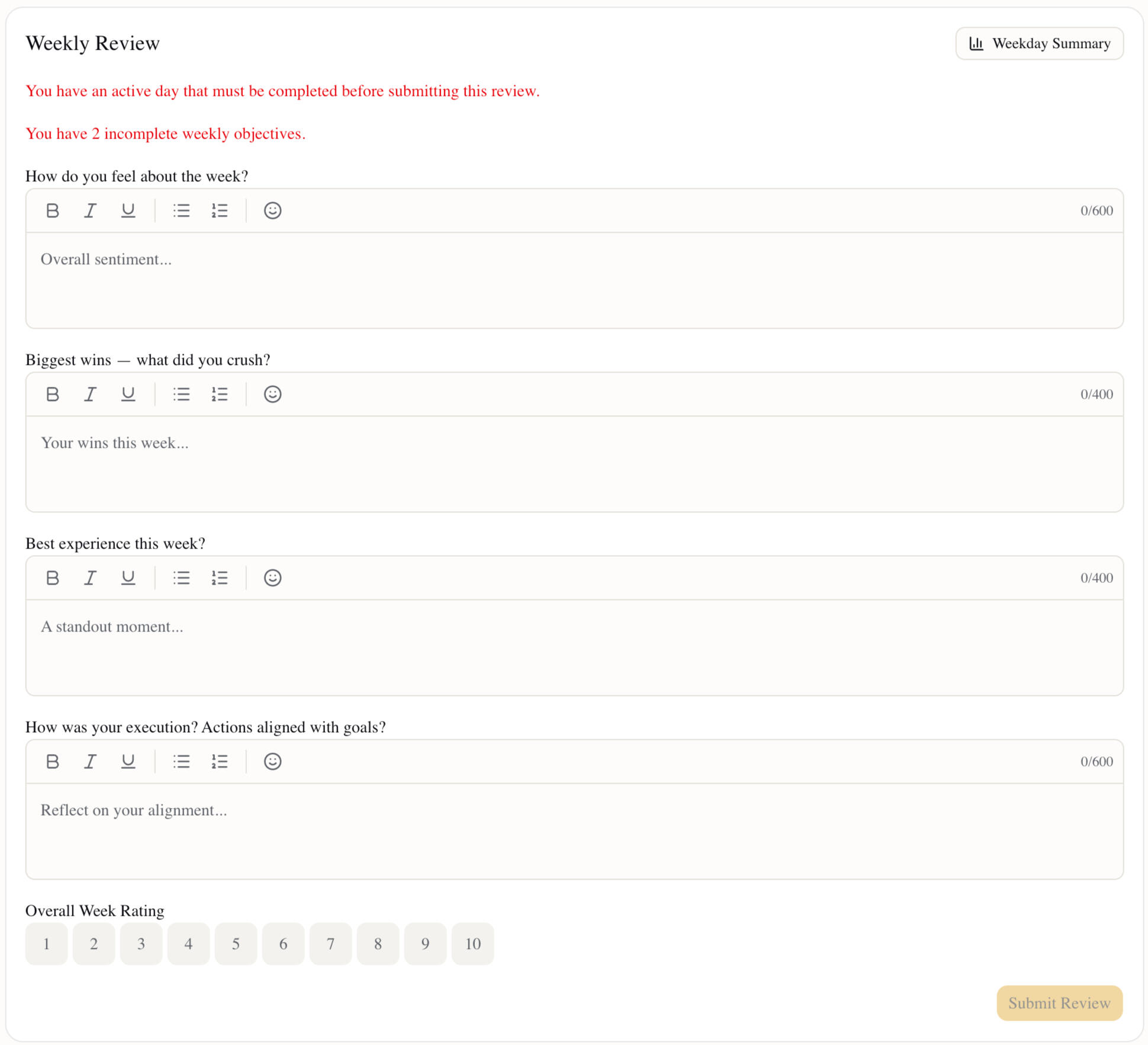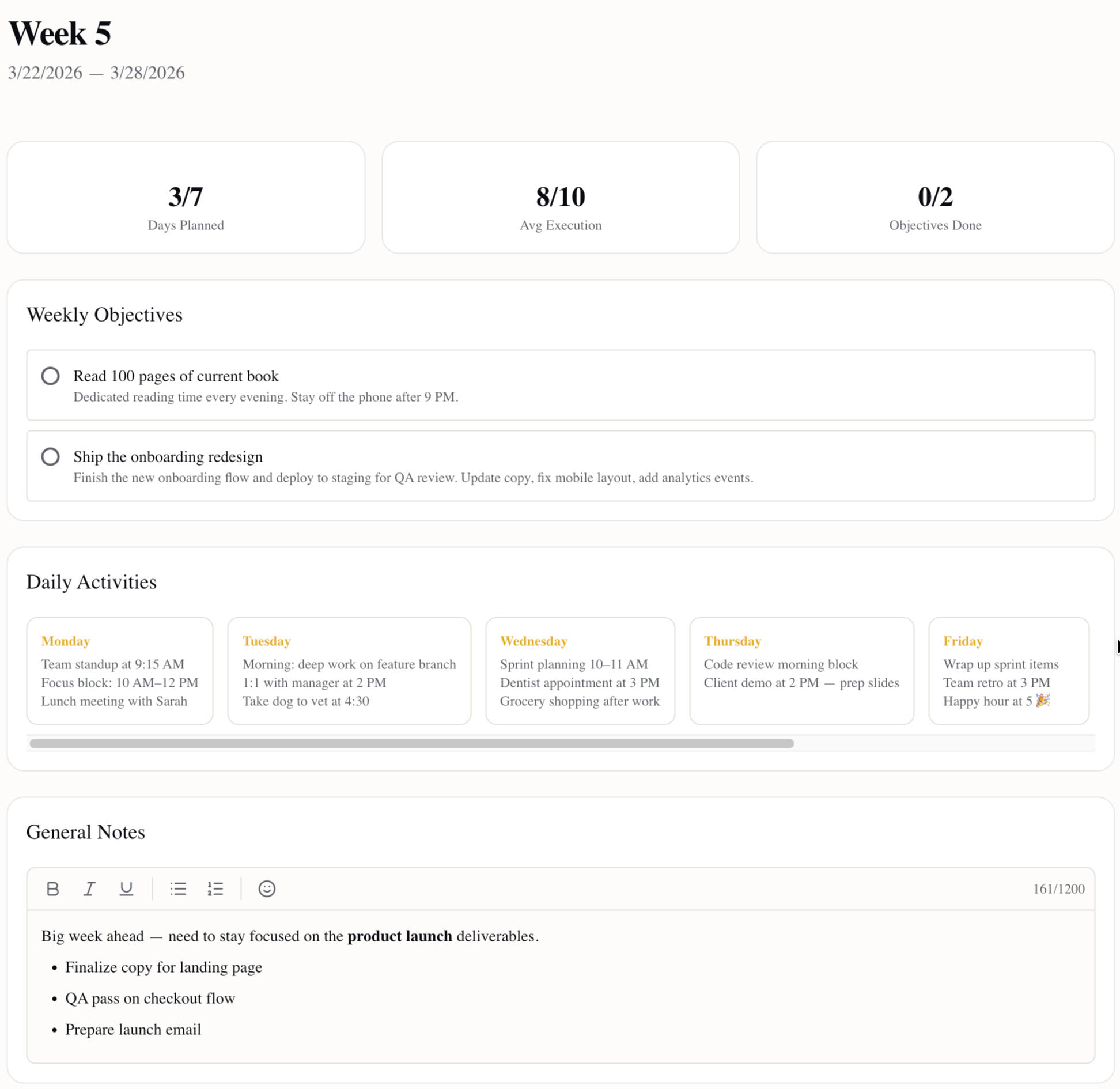 Start each week with clarity. Track your important objectives. Summarize each week with an execution rating.