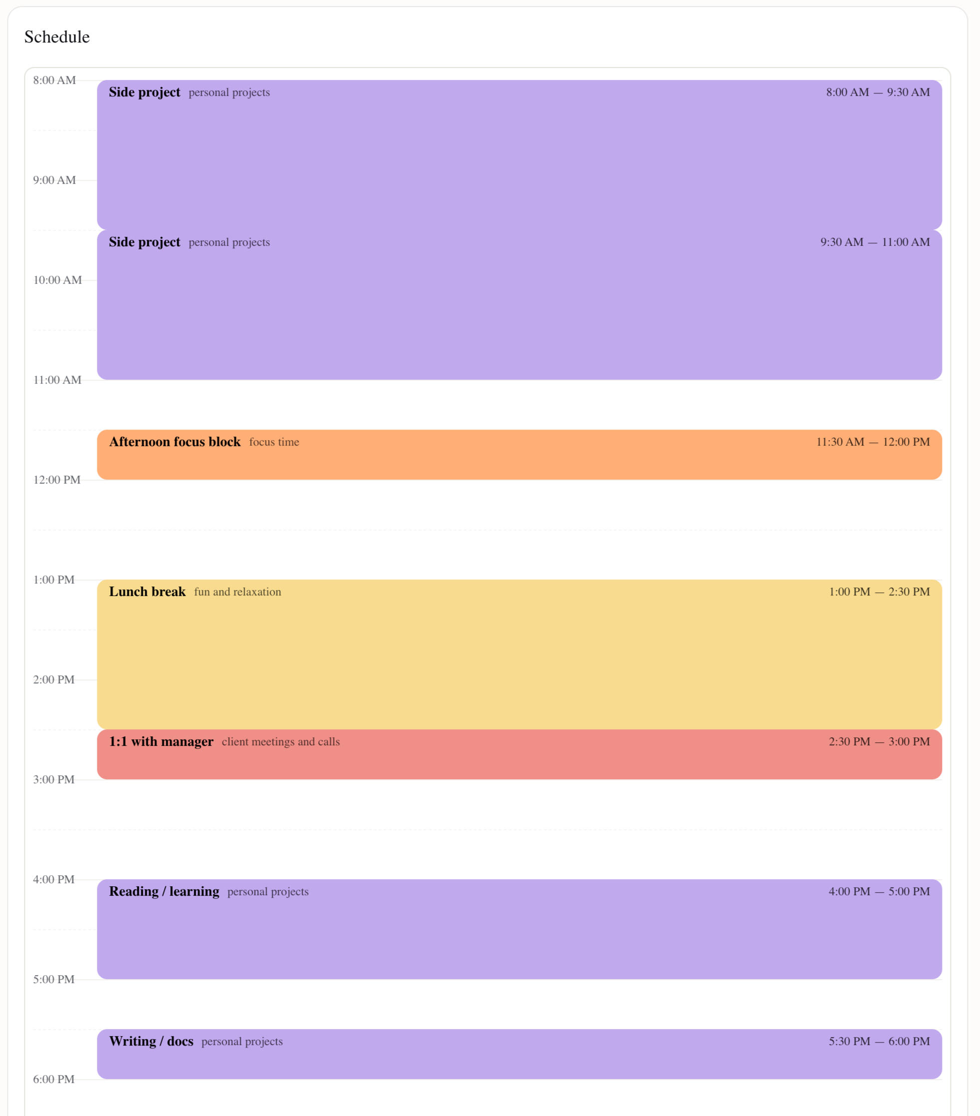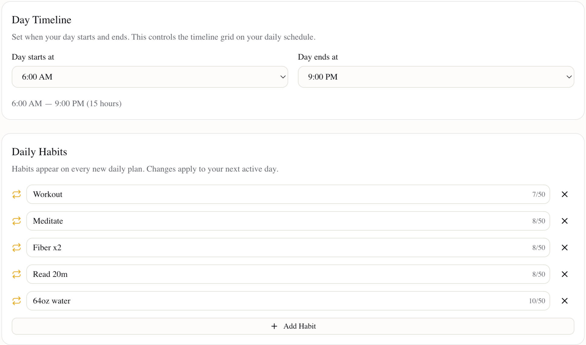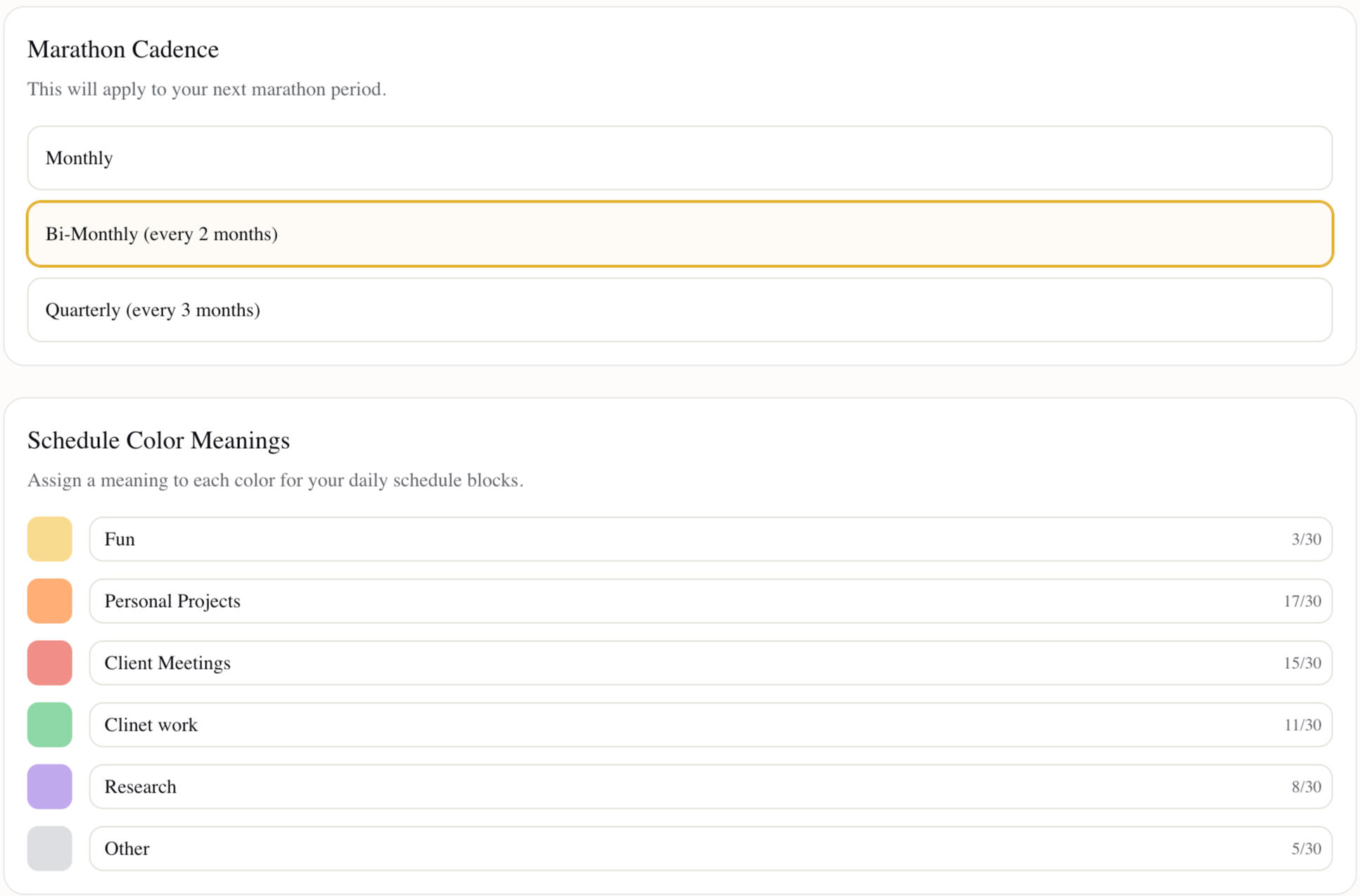 Ideal Day is a flexible journaling and planning app. We don't force you into a specific day length, task categories, or marathon duration. Configure your settings through a 2-minute onboarding process. Change them any time.