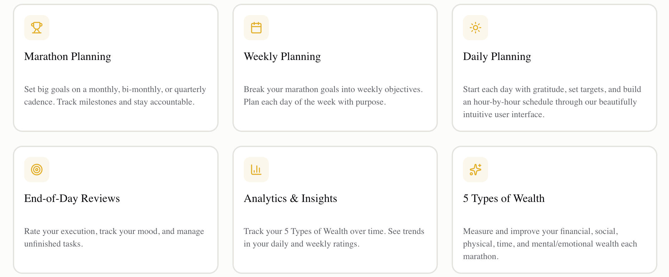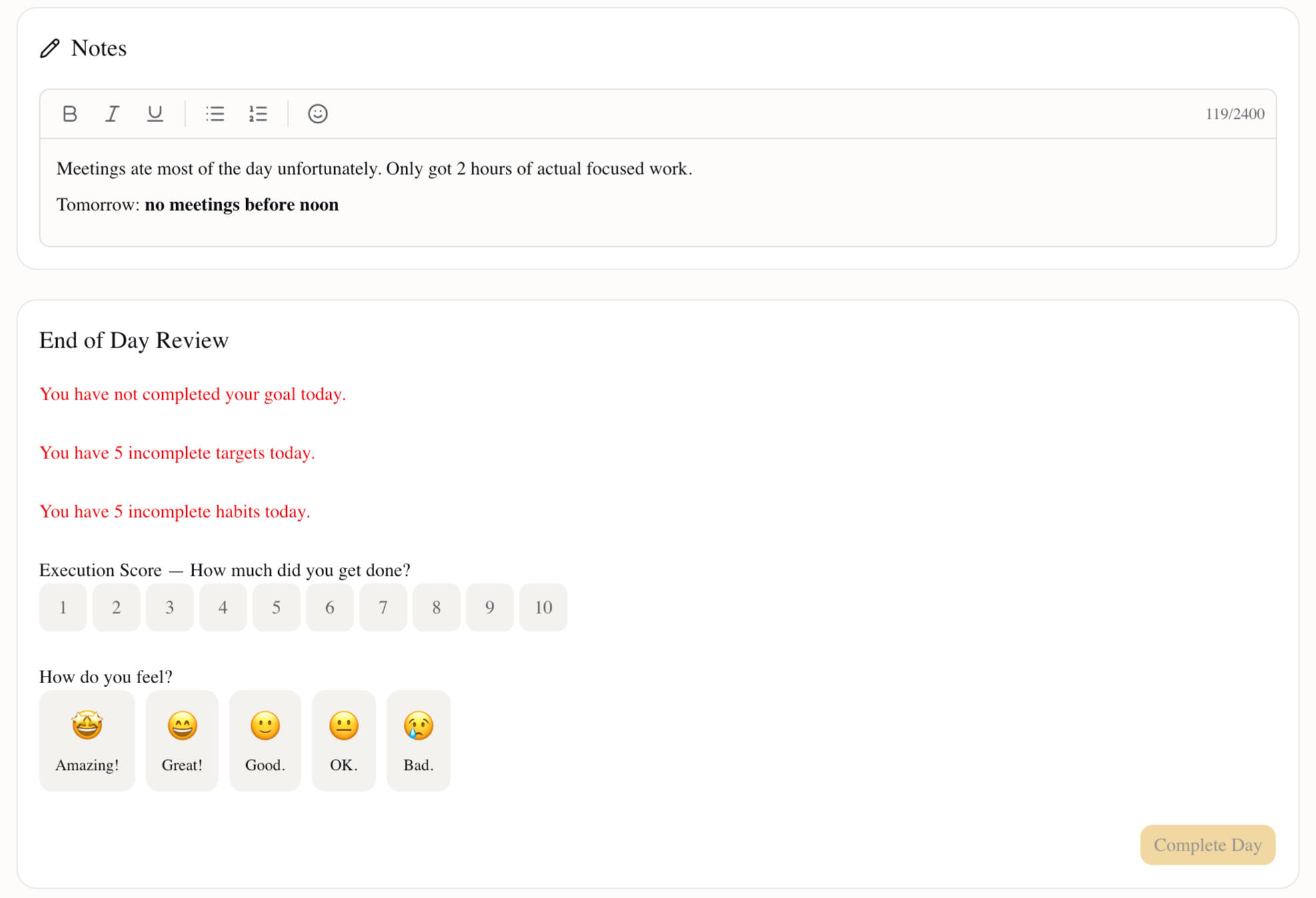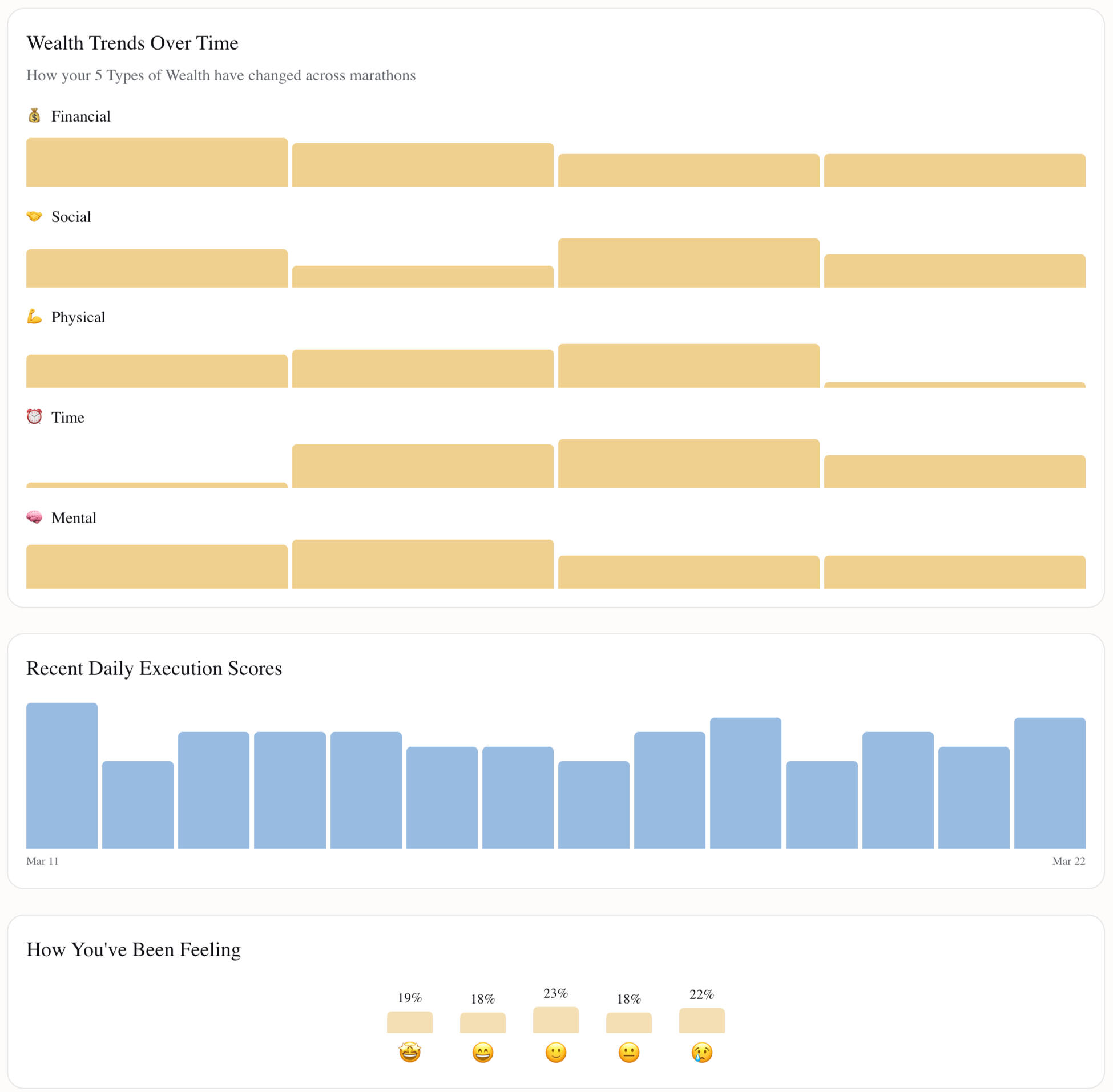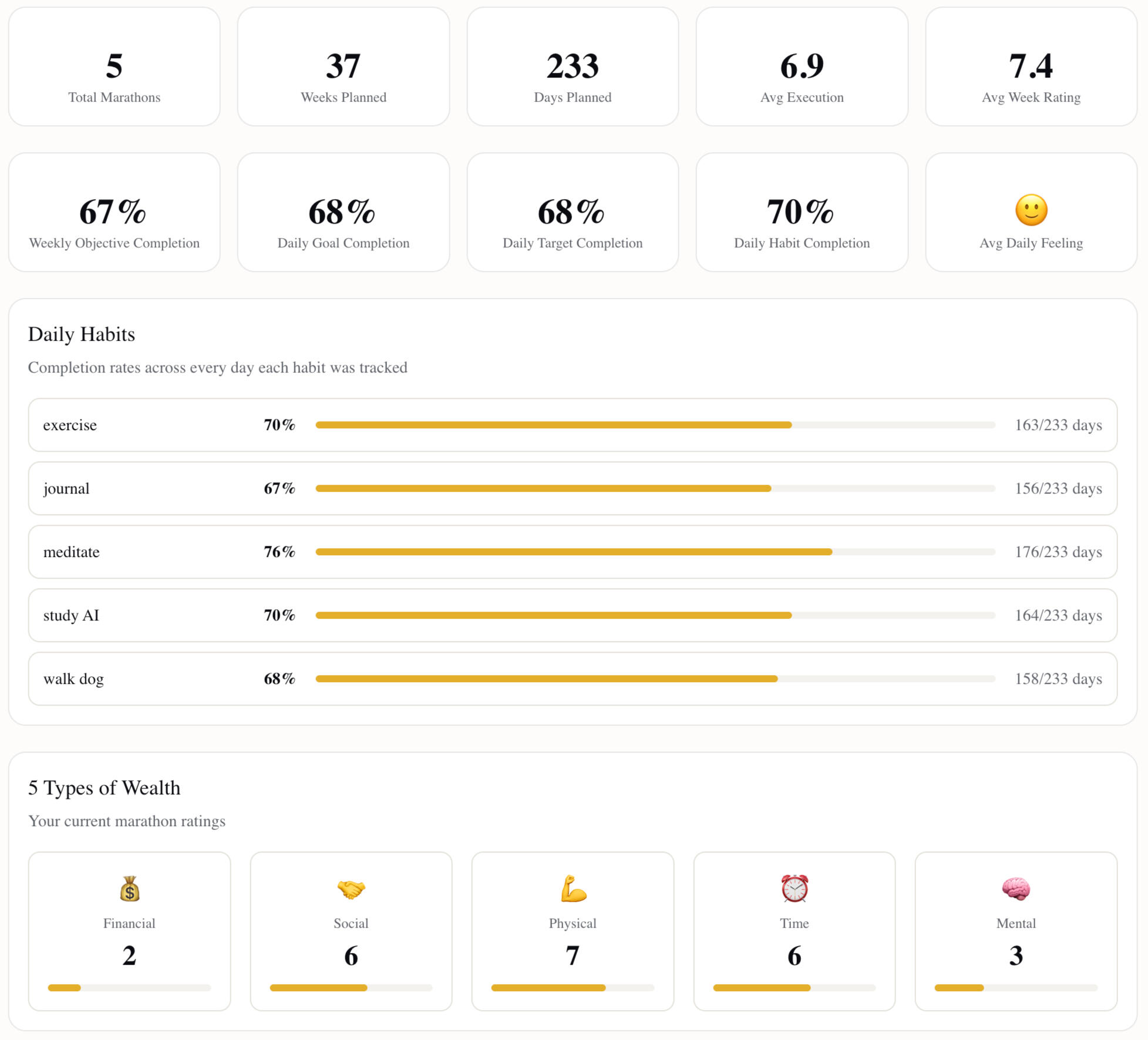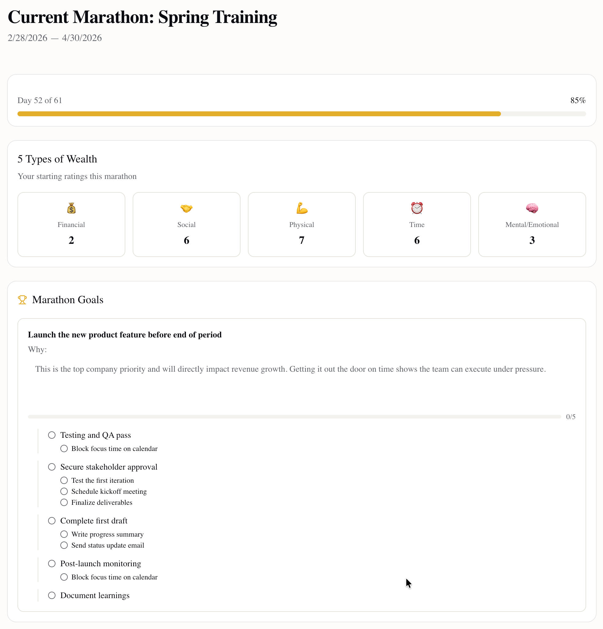 Ideal Day features a marathon period for big goals. Set your long term goals, track them daily, and execute with clear insight.