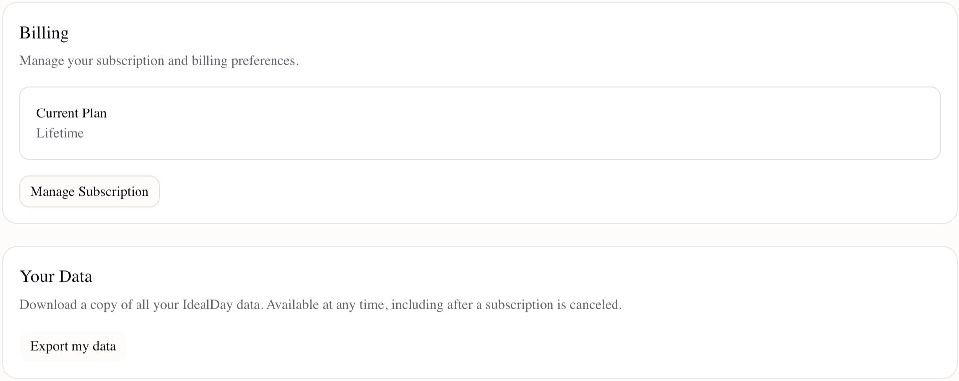 Ideal Day allows you to export your data any time. No active subscription required. Easily cancel your subscription any time.