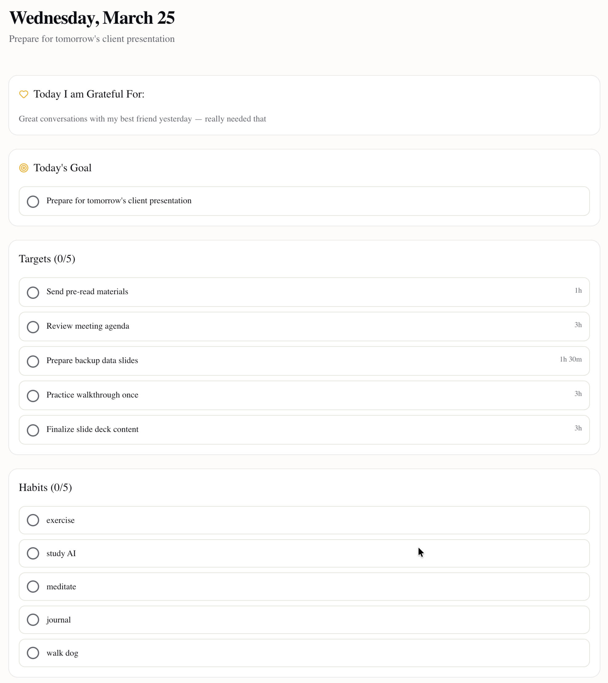 Start each day reflecting on what you're grateful for. Set your day's big goal, break it down into targets. Track your daily habits. Build your daily schedule with our beautiful drag-n-drop schedule editor.